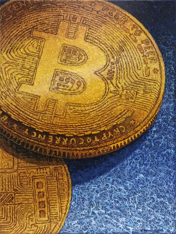 “Bitcoin” Acrylic on Canvas 24”x18” in a new style Steve is working on- this piece sold days after completion